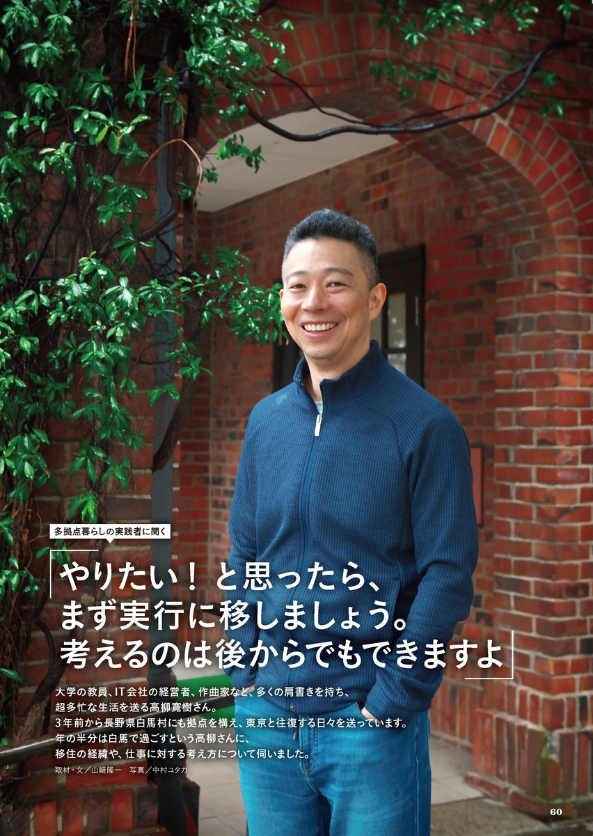 2020-05-19 多拠点生活実践者として弊社代表高柳のインタビューが『複住スタイル』に掲載されました! 2020年5月14日発売「複住スタイル」(英和出版社)の誌面に、2018年長野県白馬村に移住して、現在東京と白馬村を行き来しながら、ビジネス、教員、スキーヤーなど、さまざまな活動を継続する多拠点生活実践者として弊社代表取締役、高柳のインタビューが掲載されています。 奇しくもコロナ禍によって、これまでの生活スタイルを改めて考えてみる、いい機会かもしれません。書店、コンビニなど絶賛発売中です。ぜひお手に取ってご覧ください。 Amazonからの購入はこちら 楽天ブックスからの購入はこちら 弊社代表取締役、高柳インタビュー掲載ページ(P.60~) 「複住スタイル」(5/14発売号)